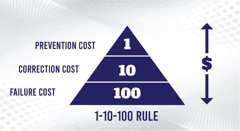 세계적인 물류 회사 「페덱스(Fedex)」에서 중요시한다고 알려진 품질 비용에 관련된 「1-10-100 법칙」이 있습니다. 문제가 발생하기 전 예방했을 때 지불해야 하는 비용이 1이라고 하면, 고객이 발견하기 전 수정하는데 필요한 비용은 10배가 발생하고, 고객이 문제 발생을 발견하여 수정해야 하는 경우 필요한 비용은 100배가 든다라는 뜻입니다. 즉, 미리 예방을 하면 나중에 들어가는 엄청나게 큰 비용(시간과 돈)을 지불하지 않아도 된다는 뜻입니다.
